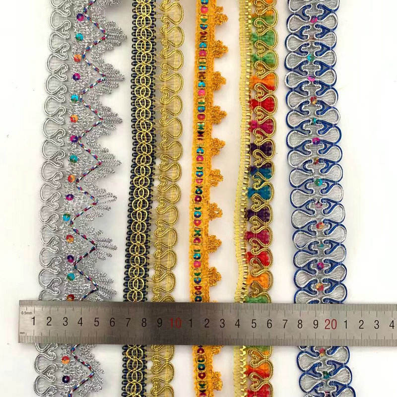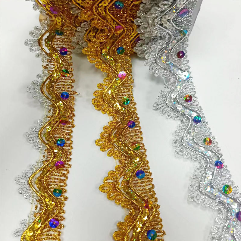 Drabužių aksesuarai Auksinės ir sidabrinės metalinės pasienio nėrinių apdaila daugiaspalviai blizgučiai aukso siūlų metaliniai nėriniai apdaila, papuošta aukso ir sidabriniais dvigubintais metaliniais laidais ir septynių spalvų blizgučiais, sukuria nuostabų ir apakinantį apvadu. Tai tinka rankogalių, apykaklių ir aukštos klasės drabužių, tokių kaip vakarinės suknelės, scenos kostiumai ir vestuvinės suknelės, dekoravimui. Medžiaga yra lengva ir lanksti, neišnyksta ar tabletės ir palaiko pasirinktinį plotį ir raštus, pridedant prabangų blizgesį prie drabužių.