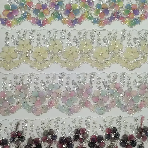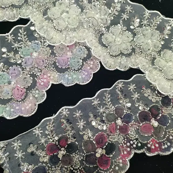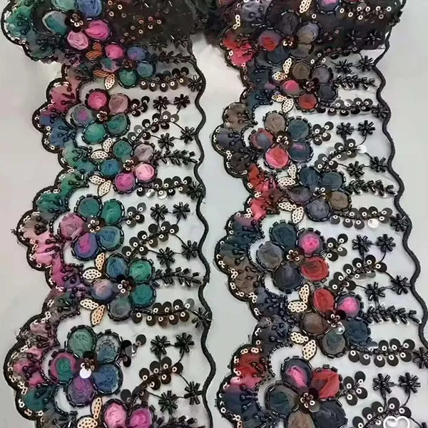 Daugiaspalviai siuvinėti nėriniai su 3D tinklelio gėlėmis juostele, karoliukų vamzdeliu, brūkšninio kodo siuvinėjimo nėriniai