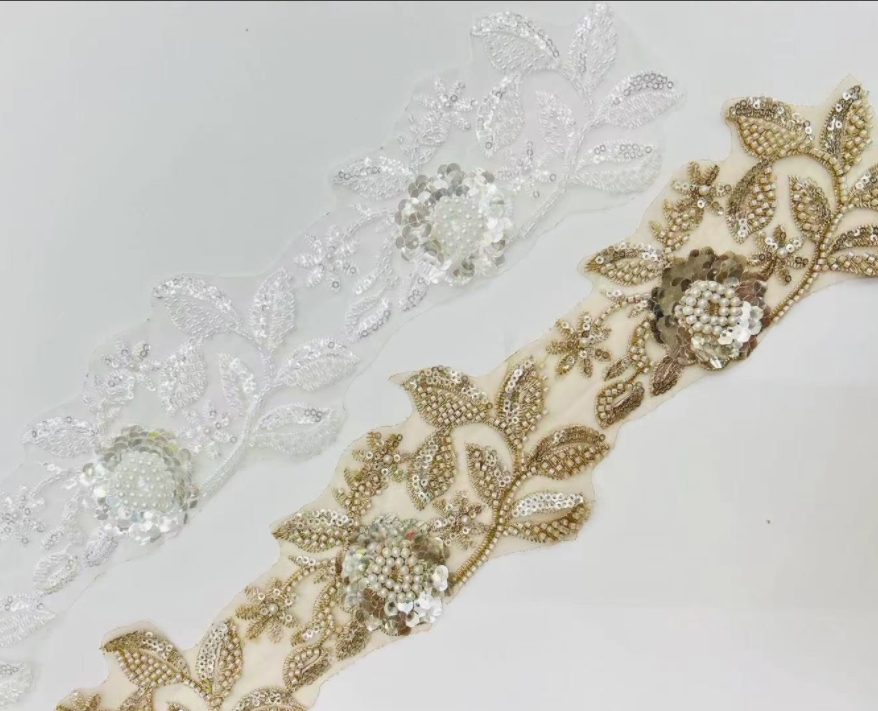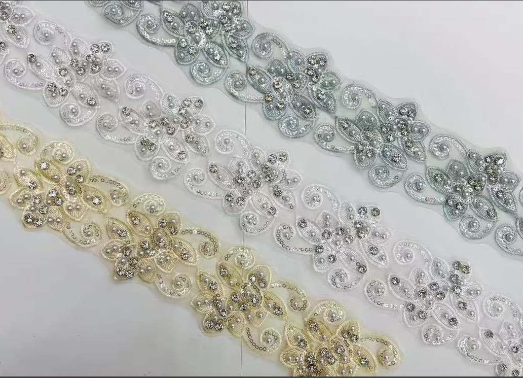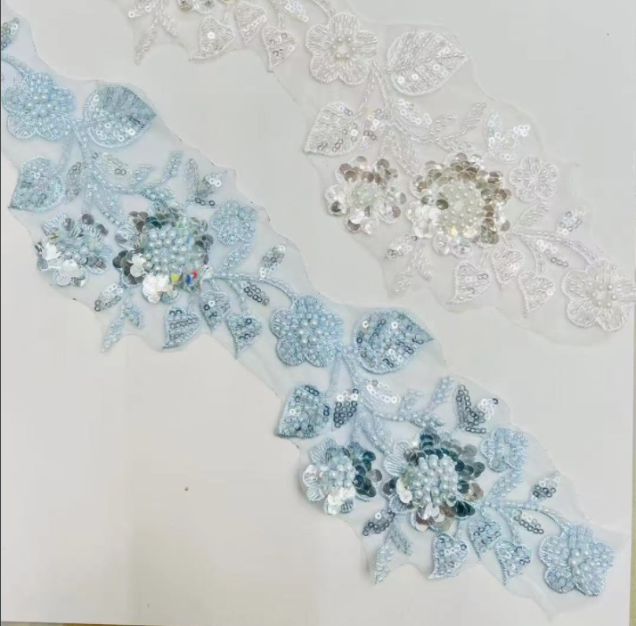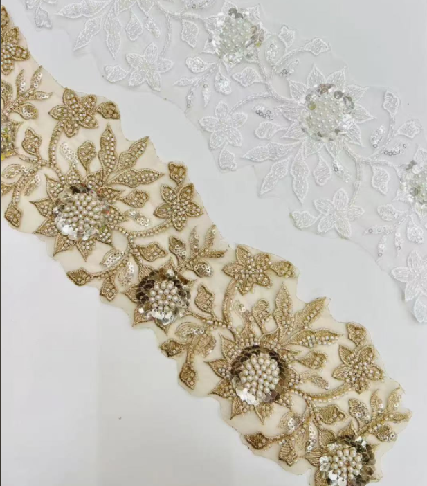 Nauji atvykimo dekoratyviniai drabužiai, siuvami gražios pyntos segtuotos perlų karoliukų nėrinių apdaila. Jis priima derinį trimatės virvių audimo, blizgančių blizgučių ir blizgaus karoliuko dizainą, kuriame yra sodrių sluoksnių ir subtilus prisilietimas. Jis tinka aukštos klasės dekoracijoms, tokioms kaip „Haute Couture“ vakarinės suknelės, vestuvinės suknelės, vakariniai krepšiai ir galvos apdangalai, lengvai sustiprinant atskirų daiktų didingumą.